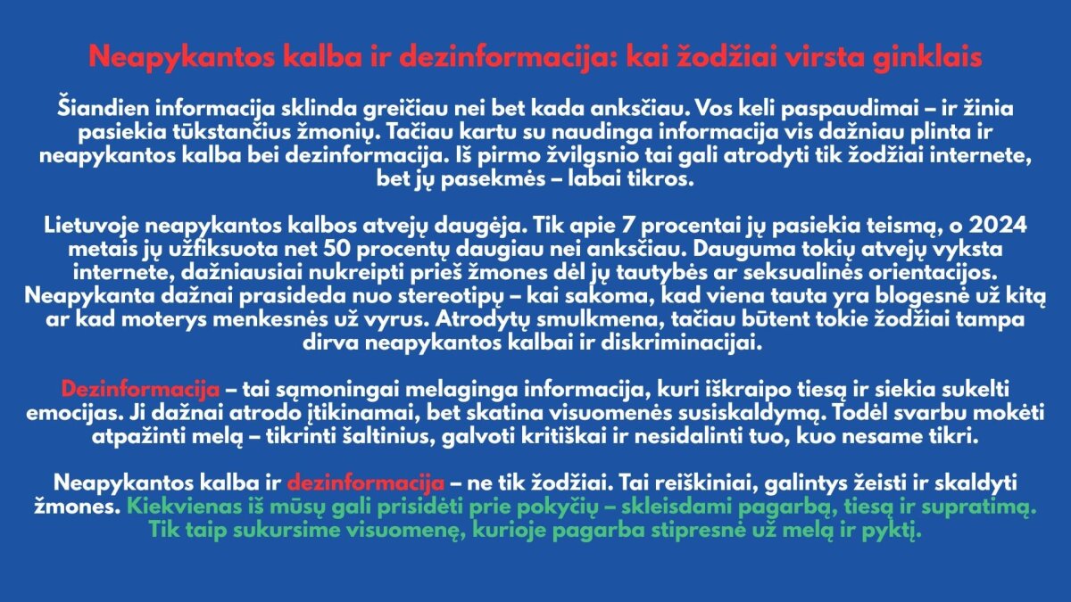 MEPA mokyklų komandos jungėsi į virtualias dirbtuves apie dezinformaciją. Gimnazijos MEPA jaunieji ambasadoriai po mokymų vedė gimnazijos bendruomenei užsiėmimus apie dezinformacijos tipus, tokius kaip netikrų naujienų srautas ir suaktyvėję „troliai“ socialiniuose tinkluose. Dalinosi patarimais, taisyklėmis, kaip išvengti dezinformacijos (ar saugūs ir patikimi informacijos šaltiniai, vengti oficialių Rusijos Federacijos ir Baltarusijos kanalų, sekti oficialias socialinių tinklų paskyras, dalintis informacija iš patikimų šaltinių, susidūrus su netikra informacija ja nesidalinti, patarkite artimiesiems, kokias naujienas ir kur skaityti), į ką atkreipti dėmesį skaitant naujienas (paklausti savęs: ar šiame šaltinyje tikrai netrūksta įrodymų ir analizės? Patikrinti, ką praneša kiti šaltiniai, pasidomėti naujienos autoriumi, patikrinti naujienos datą, įsitikinti pateikiamos vaizdinės medžiagos originalumu).