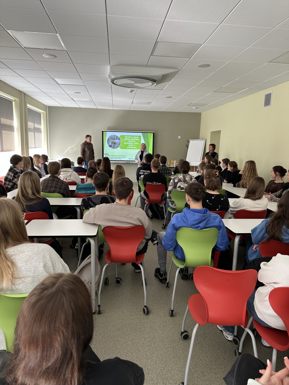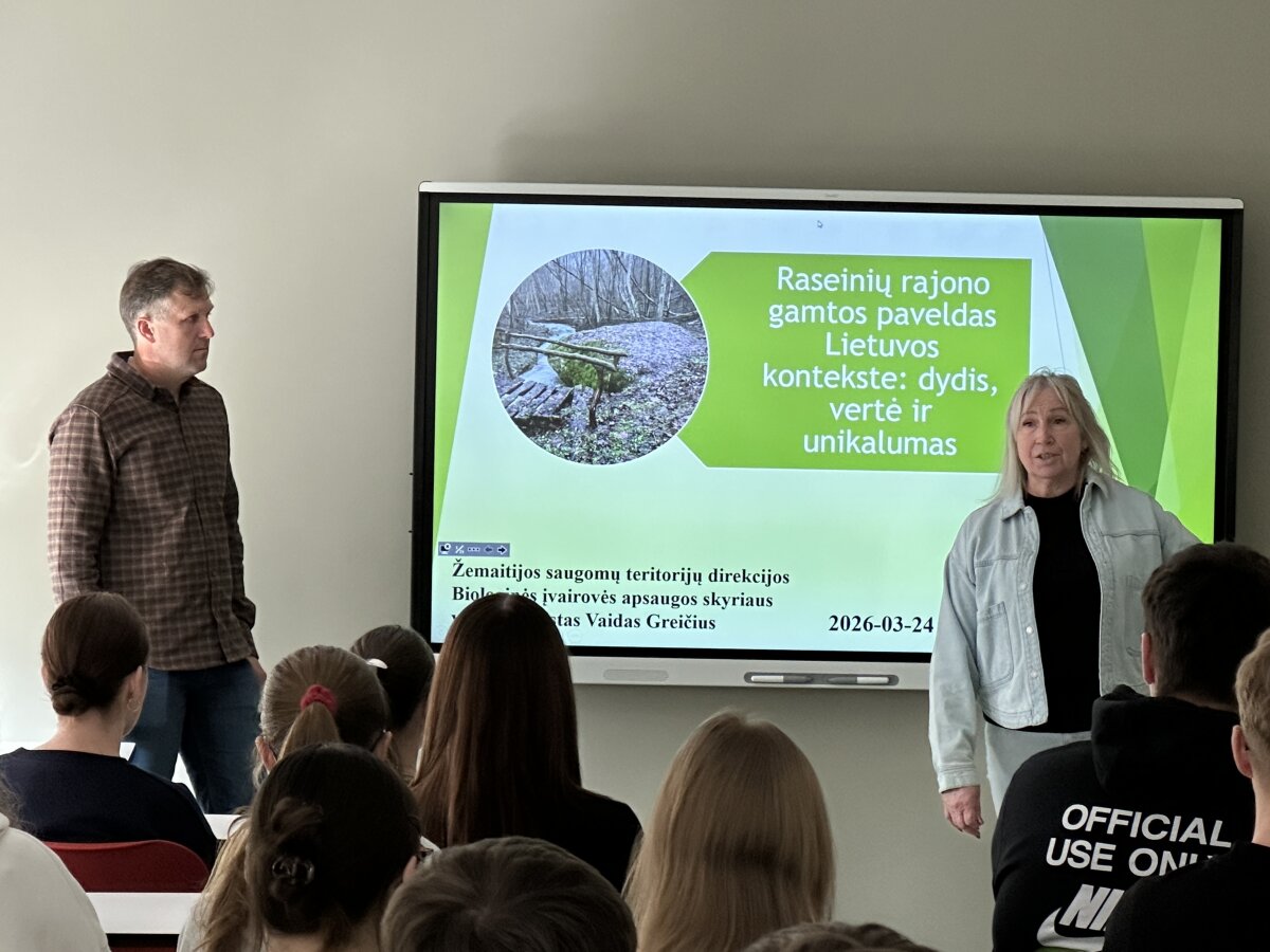 Kovo 24 dieną Prezidento Jono Žemaičio gimnazijoje svečiavosi Dubysos regioninio parko direkcijos vyr. ekologas Valdas Greičius. II ir III klasių gimnazistai kartu su ekologu paminėjo Pasaulinę Žemės dieną (kovo 20 d. minima Pasaulinė Žemės diena, astronominis pavasaris). Šiomis dienomis ateina pavasario lygiadienis – dienos ir nakties ilgumas tampa vienodas visuose Žemės rutulio kampeliuose. V. Greičius pristatė paskaitą ,,Raseinių rajono gamtos paveldas Lietuvos kontekste: dydis, vertė ir unikalumas". Mokiniai buvo supažindinti su Raseinių rajone esančiais gamtos paveldais, įdėmiai klausė paskaitos ir noriai atsakinėjo į ekologo užduotus klausimus. Po paskaitos gimnazistai ir mokytojos (K. Kriaučiūnienė, S. Stankė, R. Kauneckienė) atsigaivino stikline vandens su įvairiais priedais, taip paminėdami ir vandens dienos svarbą. Ačiū ekologui už prasmingą laiką mūsų gimnazijoje.